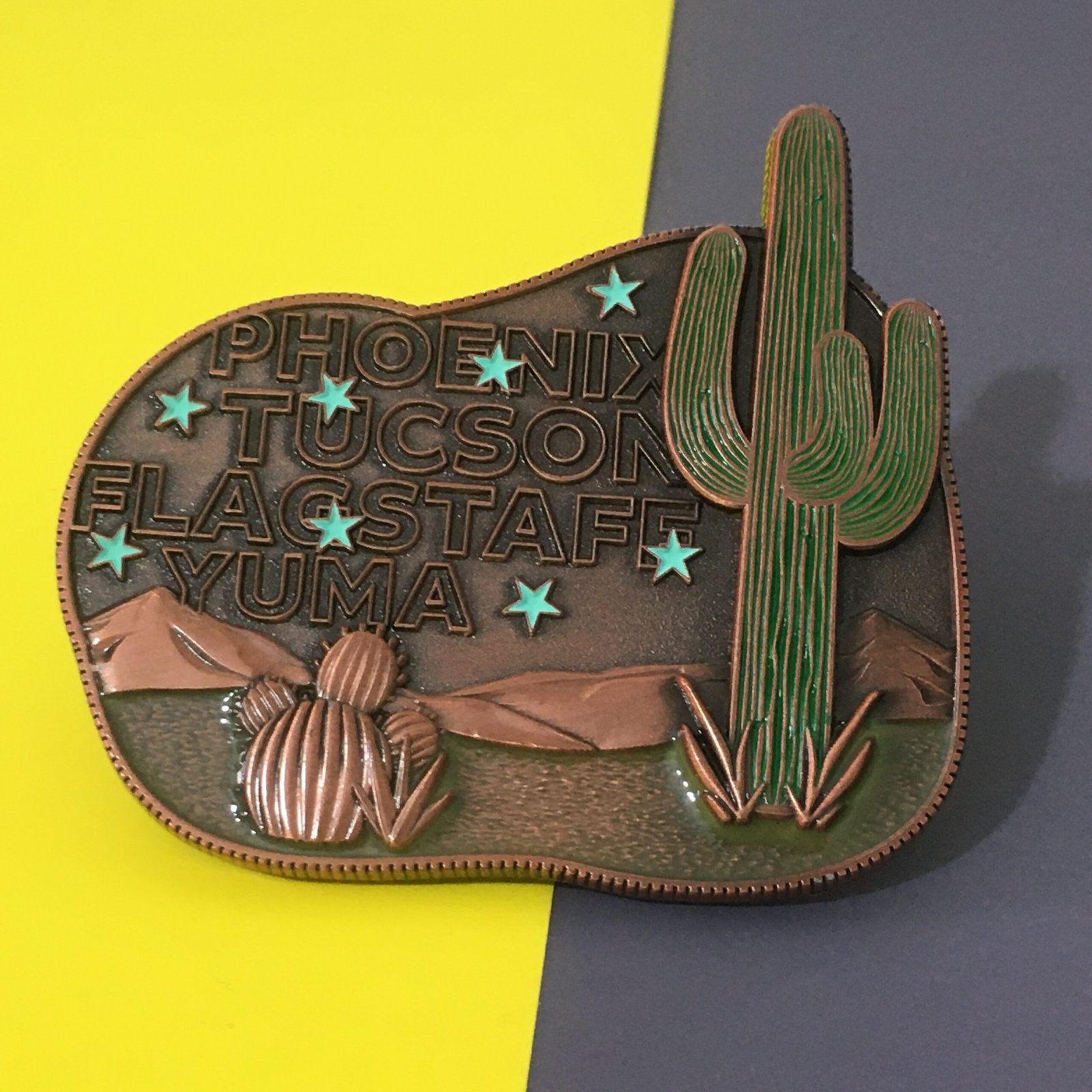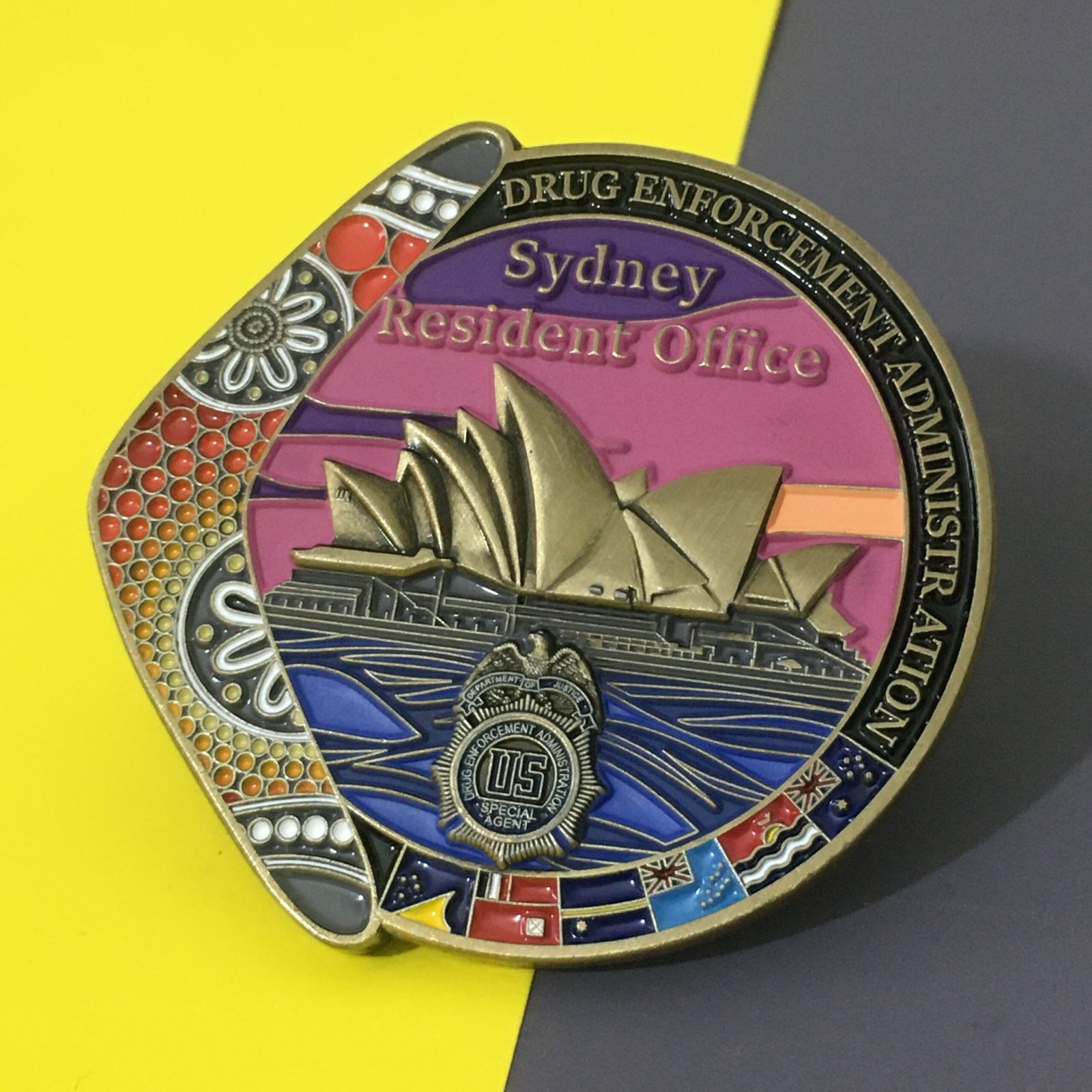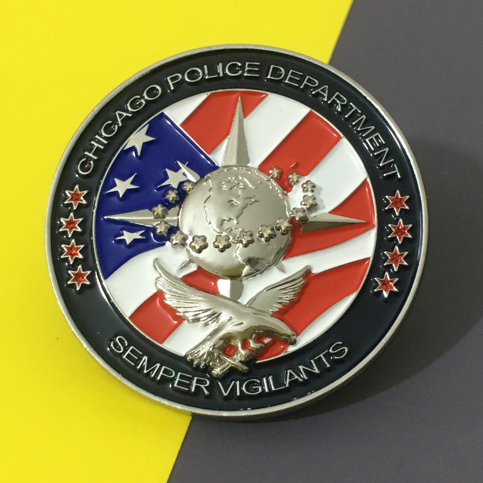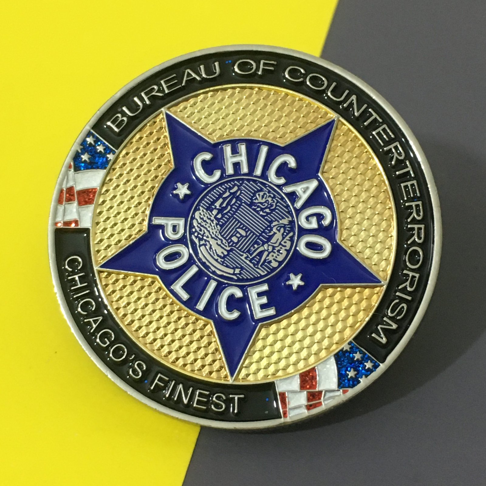 Soft enamel coins are the most popular choice for custom challenge coins. The design is stamped into metal and filled with colored enamel paints. The recessed areas give the surface a textured feel and a classic look.
