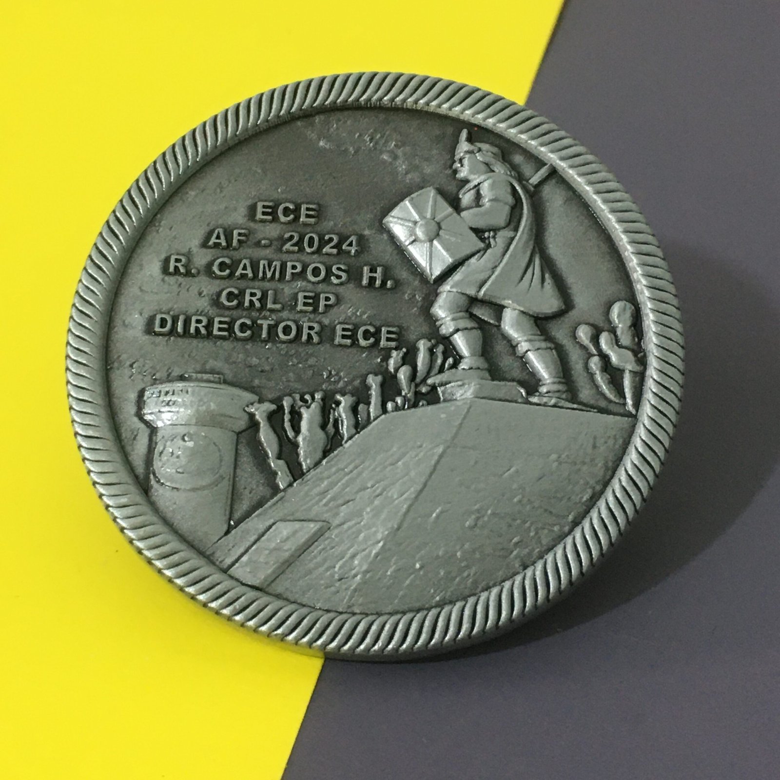 Die struck coins are made without any color, showcasing the pure metal texture. The raised and recessed metal areas create elegant contrast, often used for military challenge coins or collectible medals.